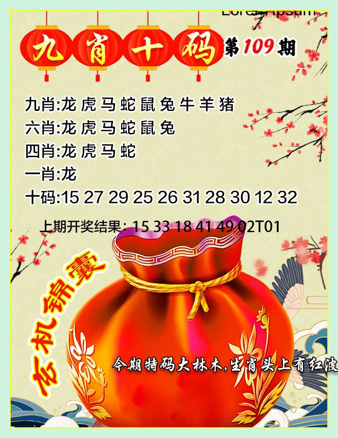 | 109期5肖 | 猪兔鸡牛虎 | |